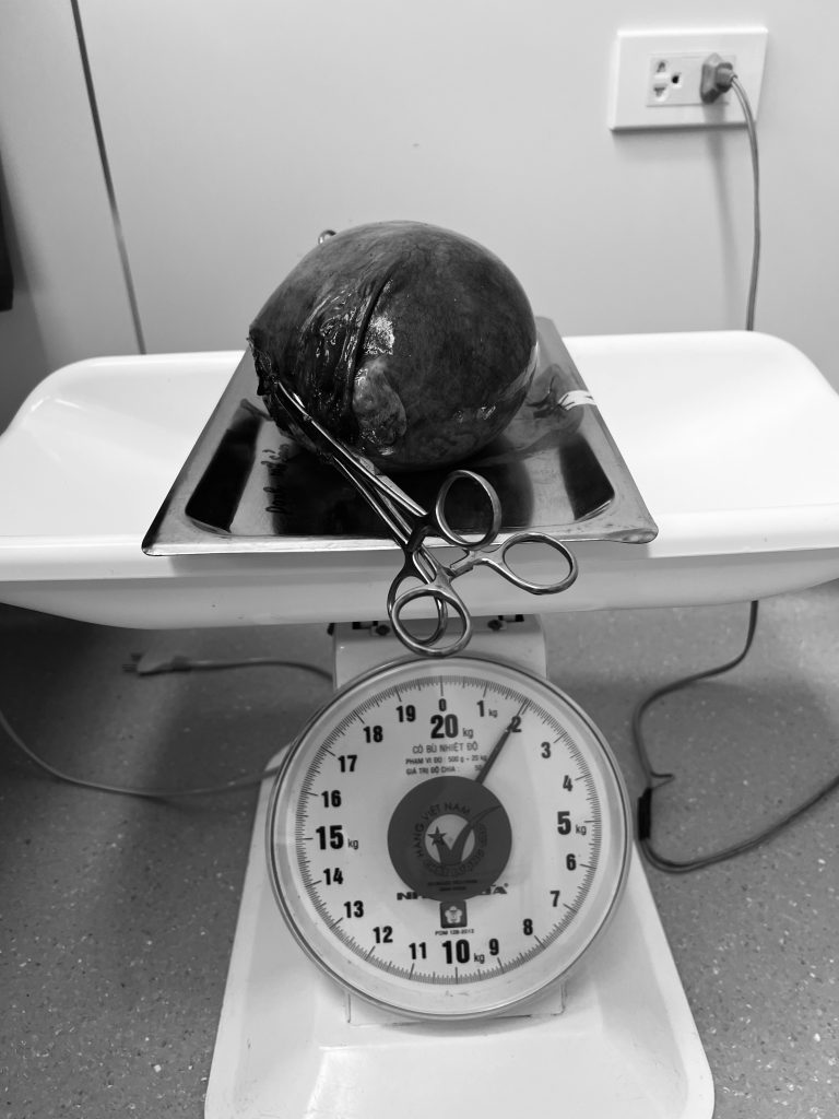 📌 Quá trình phẫu thuật đòi hỏi sự tập trung cao độ và kỹ thuật khéo léo để xử lý các dây chằng (dây chằng tròn, dây chằng thắt lưng – vòi tử cung), thắt động mạch tử cung và xử lý mỏm cắt an toàn. Sau thời gian tập trung khẩn trương, khối u xơ nặng 1,9kg đã được bóc tách thành công