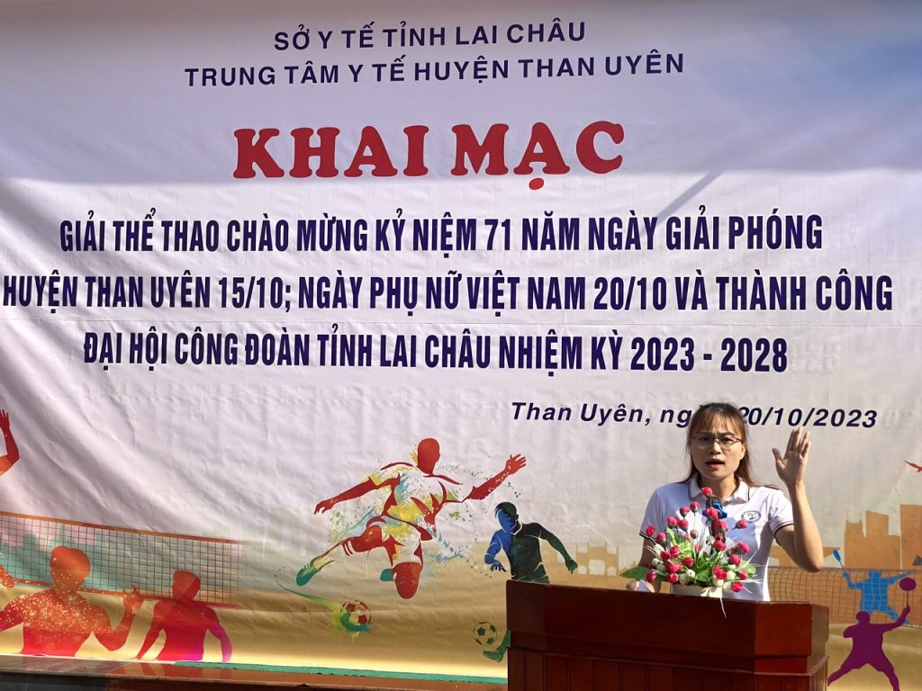 Trong không khí thi đua chào mừng ngày 20/10, hòa chung cùng với niềm vui, niềm phấn khởi, tự hào của phụ nữ Việt Nam. Sáng 20/10, Trung tâm Y tế Than Uyêntổ chức khai mạc Giải thể thao chào mừng kỷ niệm 71 năm ngày giải phóng huyện Than Uyên 15/10; ngày phụ nữ Việt Nam 20/10 và thành công đại hội công đoàn tỉnh Lai Châu khoá XIII, nhiệm kỳ 2023 – 2028. Dự khai mạc, về phía Trung tâm Y tế Than Uyên có đồng chí Vũ Văn Quang – Giám đốc Trung tâm Y tế; BCH Đảng bộ, Ban Giám Đốc, BCH Công đoàn, đoàn thanh niên. Về phía khách mời đại diện các đồng chí lãnh đạo: Trung tâm Y tế huyện Mường Tè; Bảo hiểm xã hội huyện Than Uyên; Trường Mần non Hua Nà và các Vận động viên, cổ động viên, viên chức, người lao động TTYT huyện, BHXH huyện, Trường MN Hua Nà, Công ty môi trường Hoàng Yến.