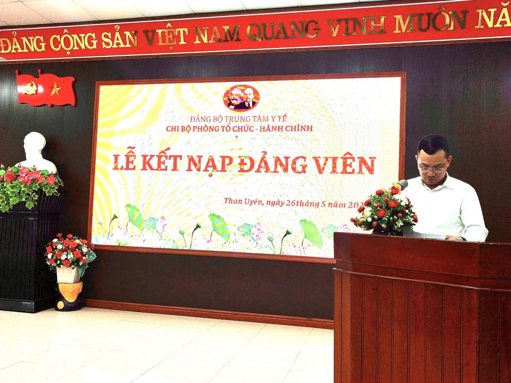 Phát biểu tại buổi lễ đ/c Vũ Văn Quang – Bí thư Đảng bộ, Giám đốc Trung tâm Y tế chúc mừng các Chi bộ có thêm các đảng viên mới như có thêm sức mạnh để cùng chung tay xây dựng Đảng ngày càng vững mạnh. Bên cạnh đó, đồng chí cũng gửi gắm, nhắc nhở đến các Chi bộ và đồng chí đảng viên mới phải không ngừng bồi dưỡng, trau dồi, không ngừng rèn luyện, phấn đấu để không chỉ xứng đáng là đảng viên tiên phong, gương mẫu mà còn là những “người chiến sĩ” nhiệt huyết với đầy đủ y đức, đóng góp hết sức mình cho ngành Y tế.