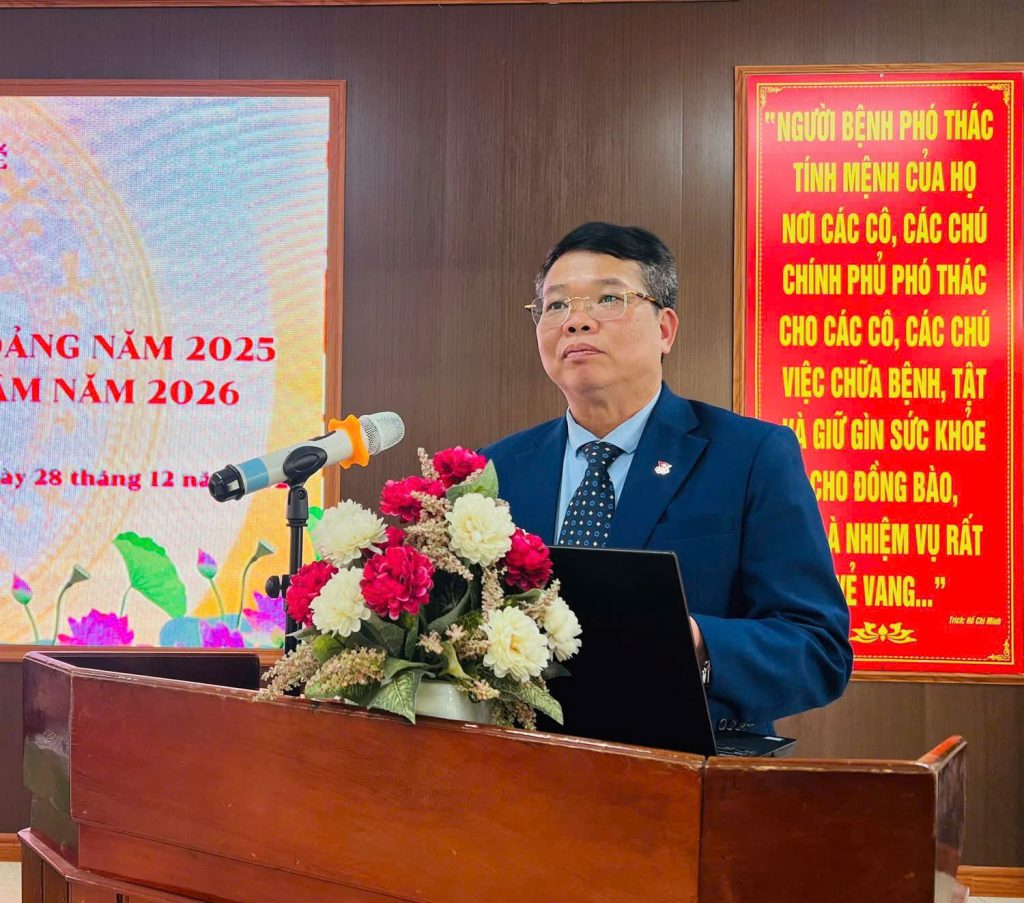 Tại hội nghị, đồng chí Đinh Xuân Thủy – Phó Bí thư Đảng uỷ đã thông qua báo cáo kết quả công tác năm 2025 như: Đảng bộ tổ chức thành công Đại hội lần thứ VIII (nhiệm kỳ 2025-2030); 100% chi bộ sinh hoạt đạt loại Tốt (trên 90 điểm) theo mô hình “Chi bộ 4 tốt”, “Đảng bộ 4 tốt”. Đơn vị đã thực hiện bước đột phá khi tinh giản 12 đơn vị đầu mối và chuẩn bị bàn giao trạm y tế về địa phương theo Kết luận số 221-KL/TW. Về chuyên môn, chất lượng bệnh viện đạt 3,24 điểm; triển khai 6.111 dịch vụ kỹ thuật (161 kỹ thuật loại đặc biệt). Thành tích nổi bật: 02 Huân chương Lao động hạng III và 31 Kỷ niệm chương “Vì sức khỏe nhân dân”; 11 Tập thể, 59 cá nhân được Sở Y tế tặng Giấy khen, 73 cá nhân được SYT công nhận Danh hiệu Chiến sĩ thi đua năm 2025.