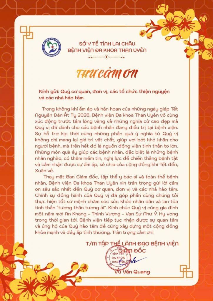 Bệnh viện Đa khoa Than Uyên xin trân trọng gửi lời cảm ơn sâu sắc tới các đơn vị, doanh nghiệp và các nhà hảo tâm đã chung tay chia sẻ, mang đến một cái Tết ấm áp cho các bệnh nhân tại viện.